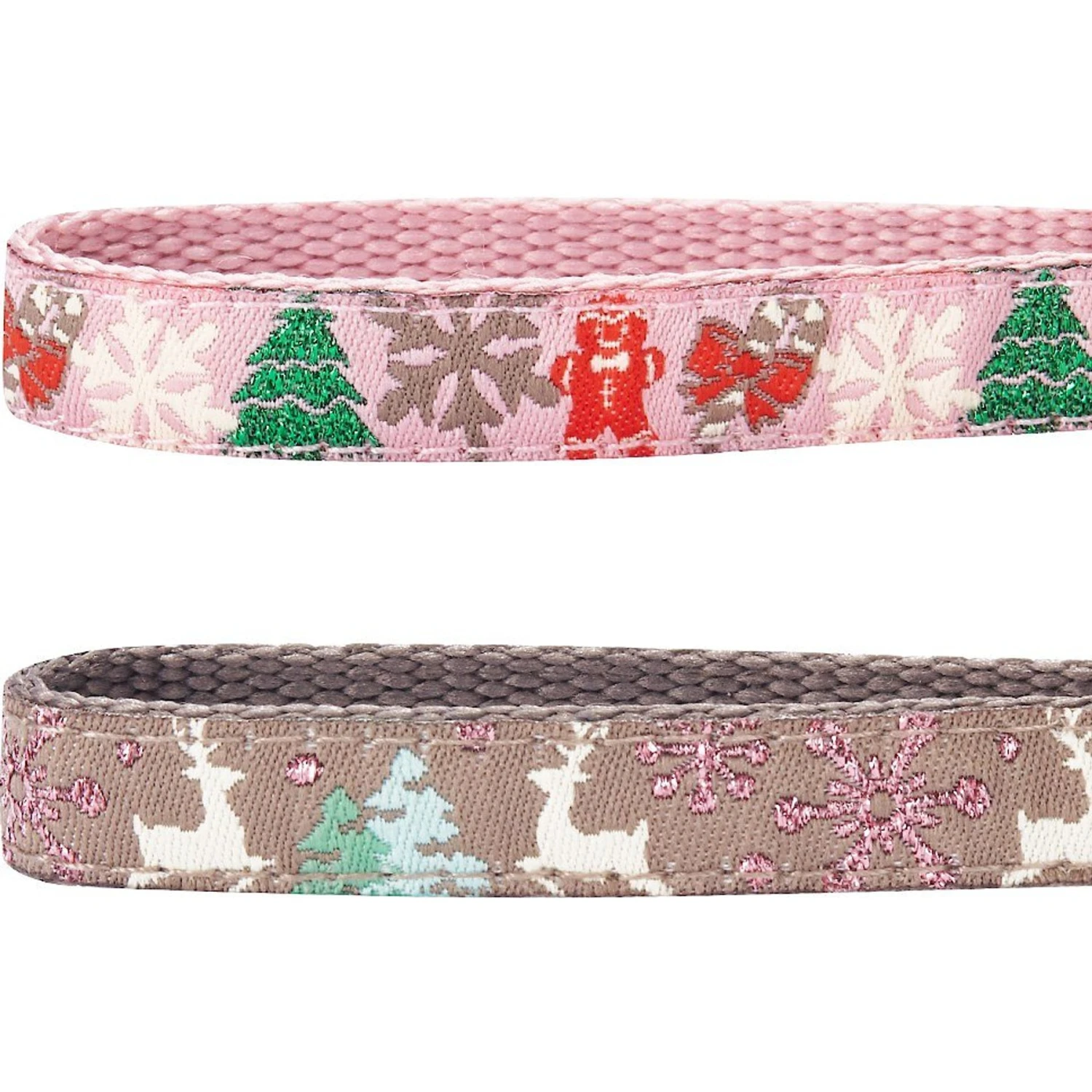 - Two cat collars—one with snowflakes, Christmas trees, gingerbread cookies and candy canes on baby pink background; another with snowflakes, Christmas trees and reindeers on khaki background.