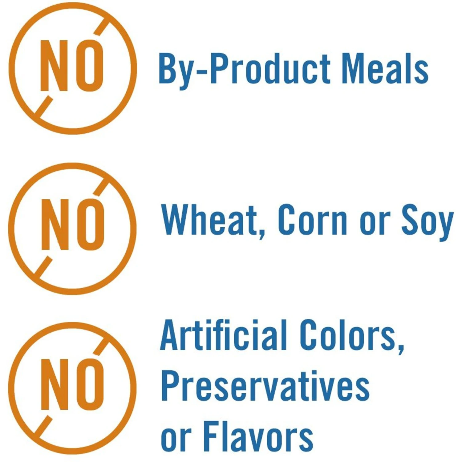 - Free from wheat, corn, soy, by-product meals, and artificial colors, flavors, and preservatives.