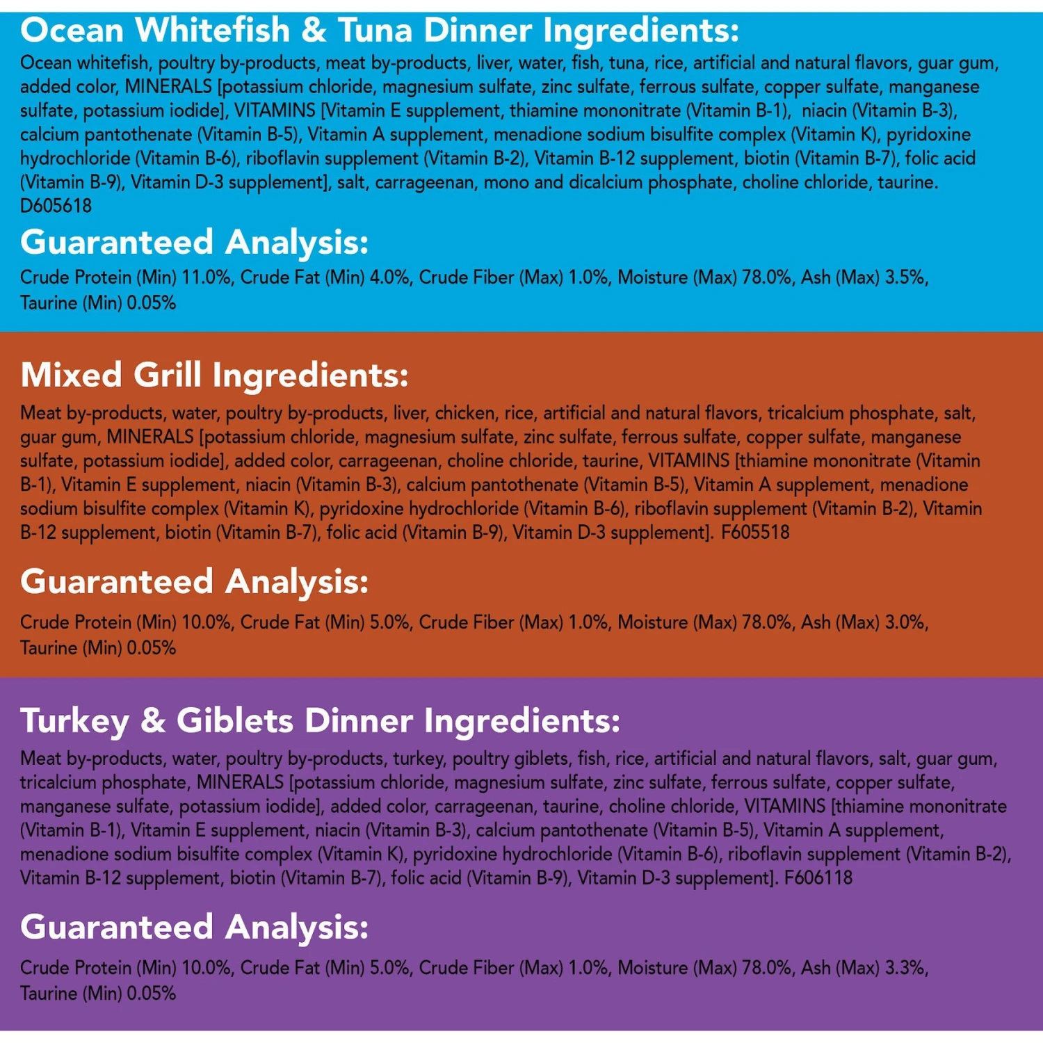 | Flavor | Country Style, Salmon, Mixed Grill, Sea Captain's Choice, Variety Pack: Fish, Chicken, Turkey, Mariner's Catch, Ocean Whitefish & Tuna, Poultry Platter, Liver & Chicken, Chicken & Tuna, Turkey & Giblets |