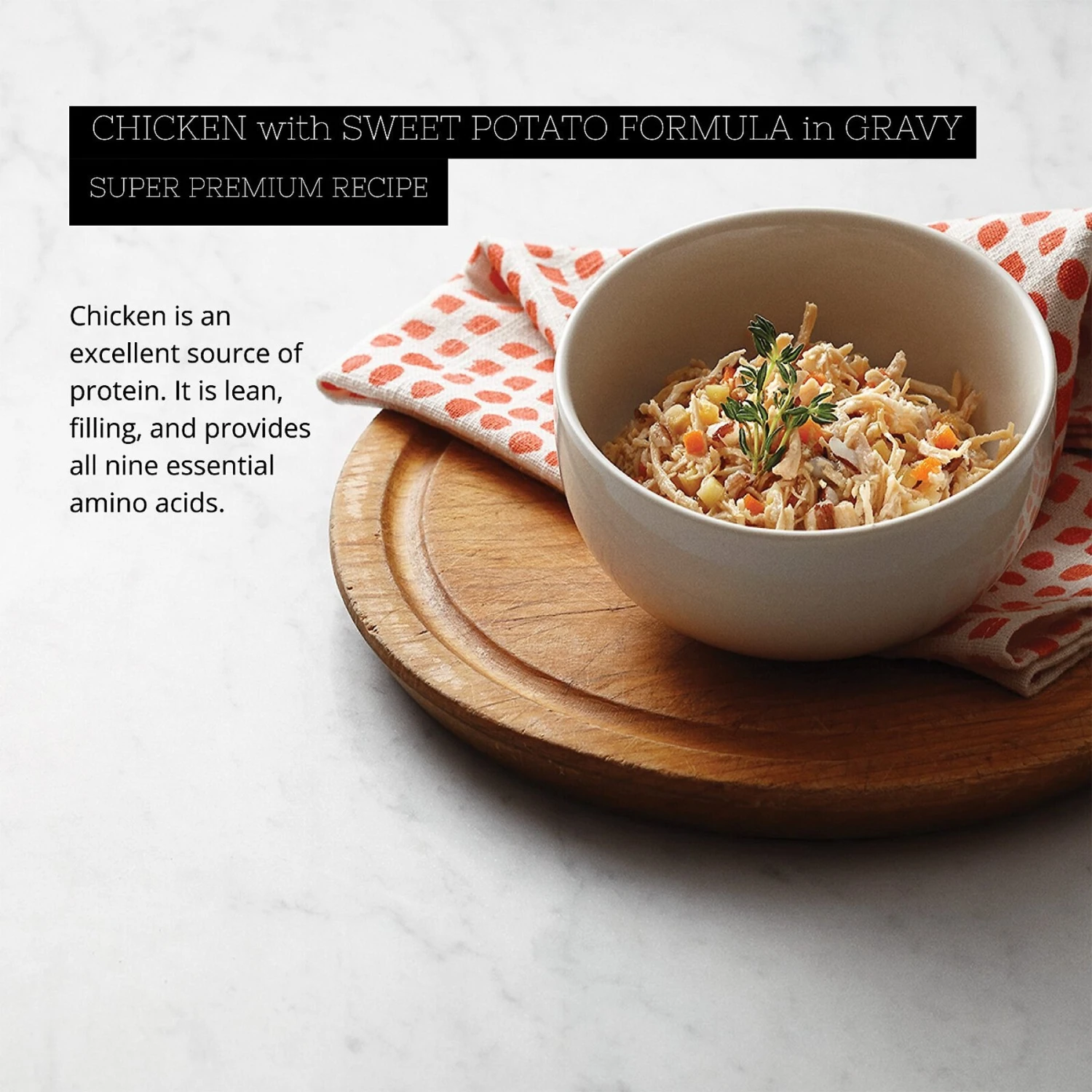 - High-quality, natural ingredients include boneless chicken, sweet potato and carrots.
