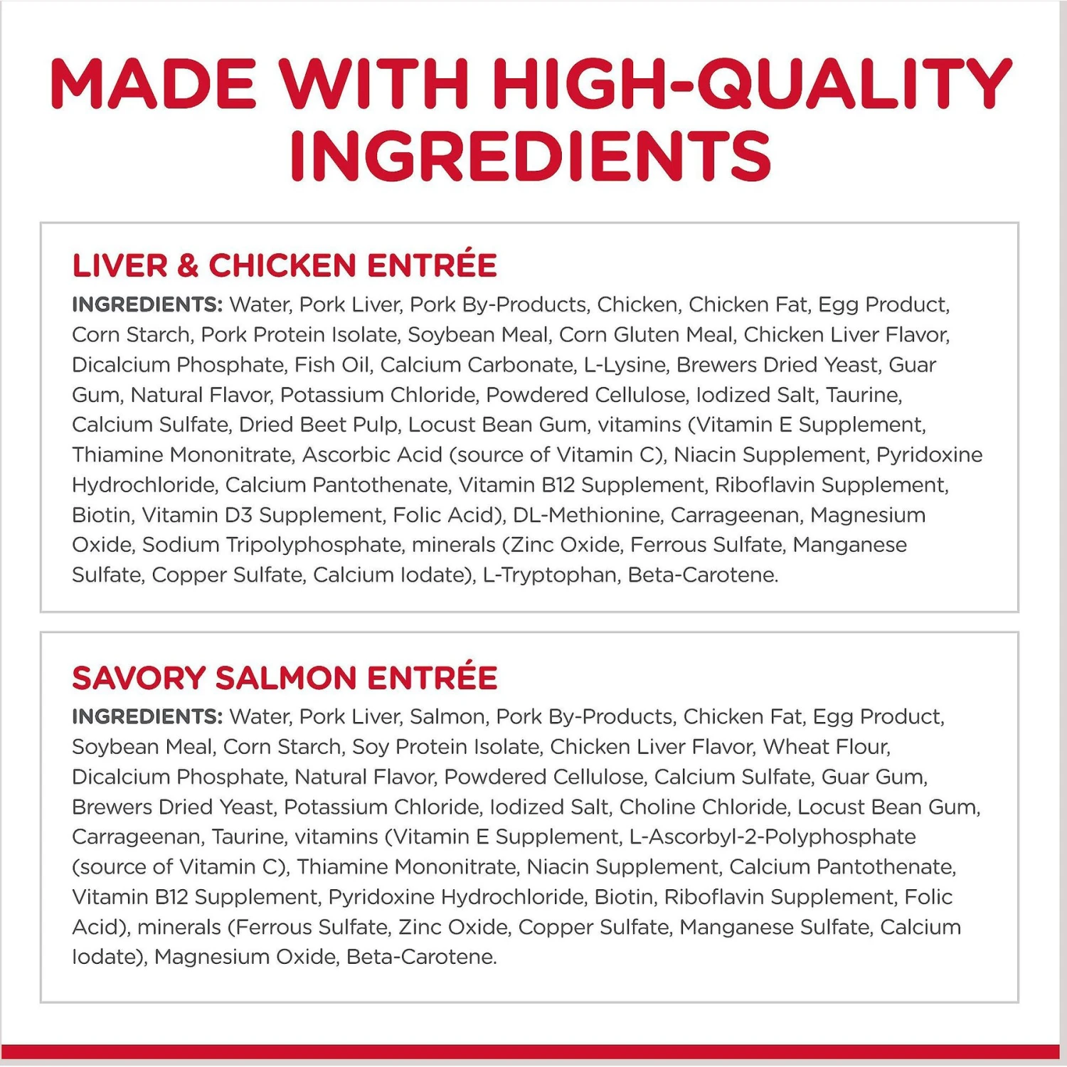 - Variety pack includes (6) cans of Hillโs Science Diet Liver & Chicken Entrรฉe and (6) cans of Hillโs Science Diet Savory Salmon Entrรฉe wet cat food.