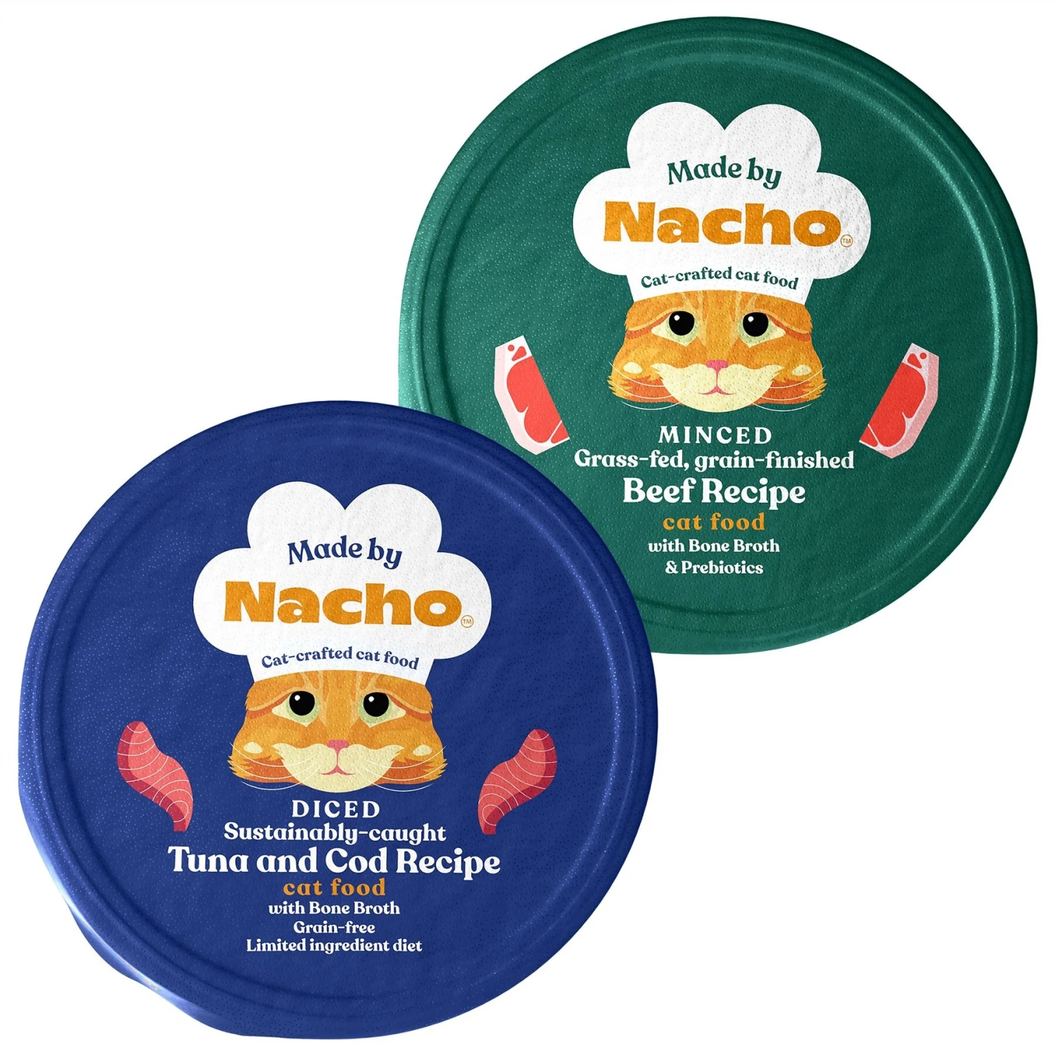 Made by Nacho Sustainably Caught Diced Tuna & Cod Recipe With Bone Broth Grain-Free Wet Cat Food, 2.5-oz cup, case of 10—Revitalize your picky feline gourmand’s flavor palate with the wholesome ingredients in Made by Nacho Sustainably Caught Diced Tuna & Cod Recipe With Bone Broth Grain-Free Wet Cat Food. Made in the USA, this nutritious meal consists of limited yet bold ingredients like sustainably caught diced tuna and cod. Paw-fect for pets who prefer limited ingredient diets, this food is doused in a savory bone broth, which gives your feline overlord essential hydration as he feasts. Free of artificial colors, flavors, preservatives, corn, grains, and soy, this well-balanced wet cat food is infused with healthy vitamins and minerals like taurine, DHA, prebiotics, Omega-3, and Omega-6, all of which work to keep your precious kitty happy and healthy so he can play, stalk, and cuddle with his favorite human servant all day long!
