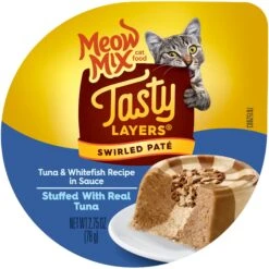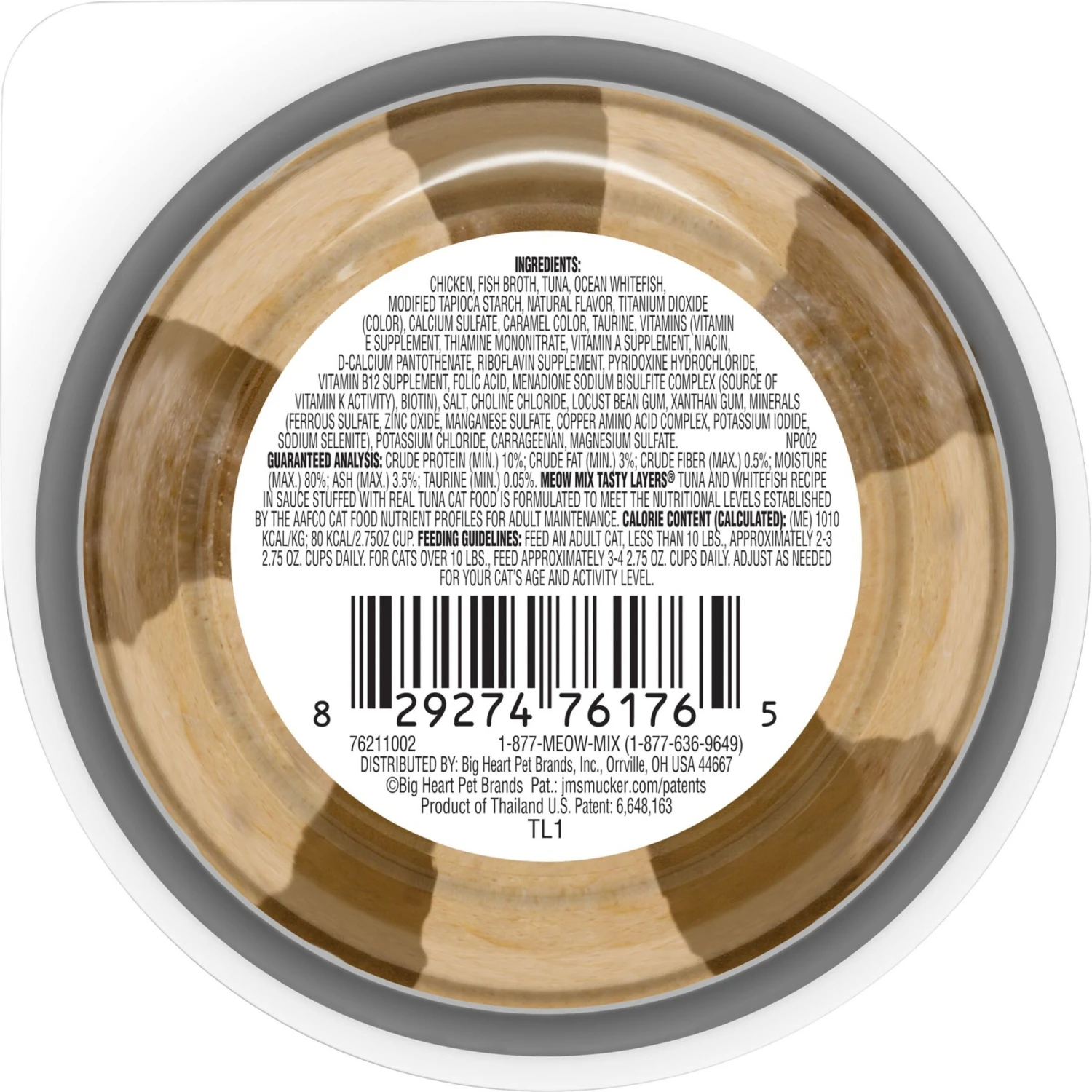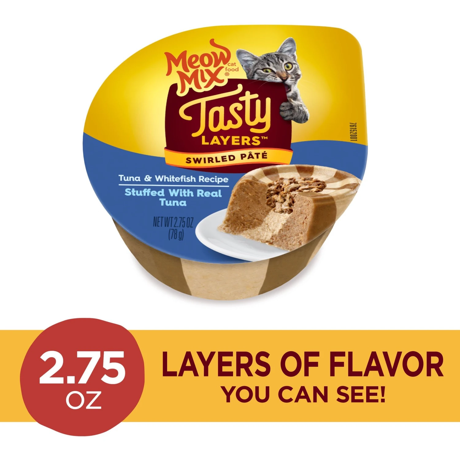 Meow Mix Tasty Layers Tuna & Whitefish Recipe Stuffed With Real Tuna Swirled Paté Cat Food, 2.75-oz Can, Case Of 12