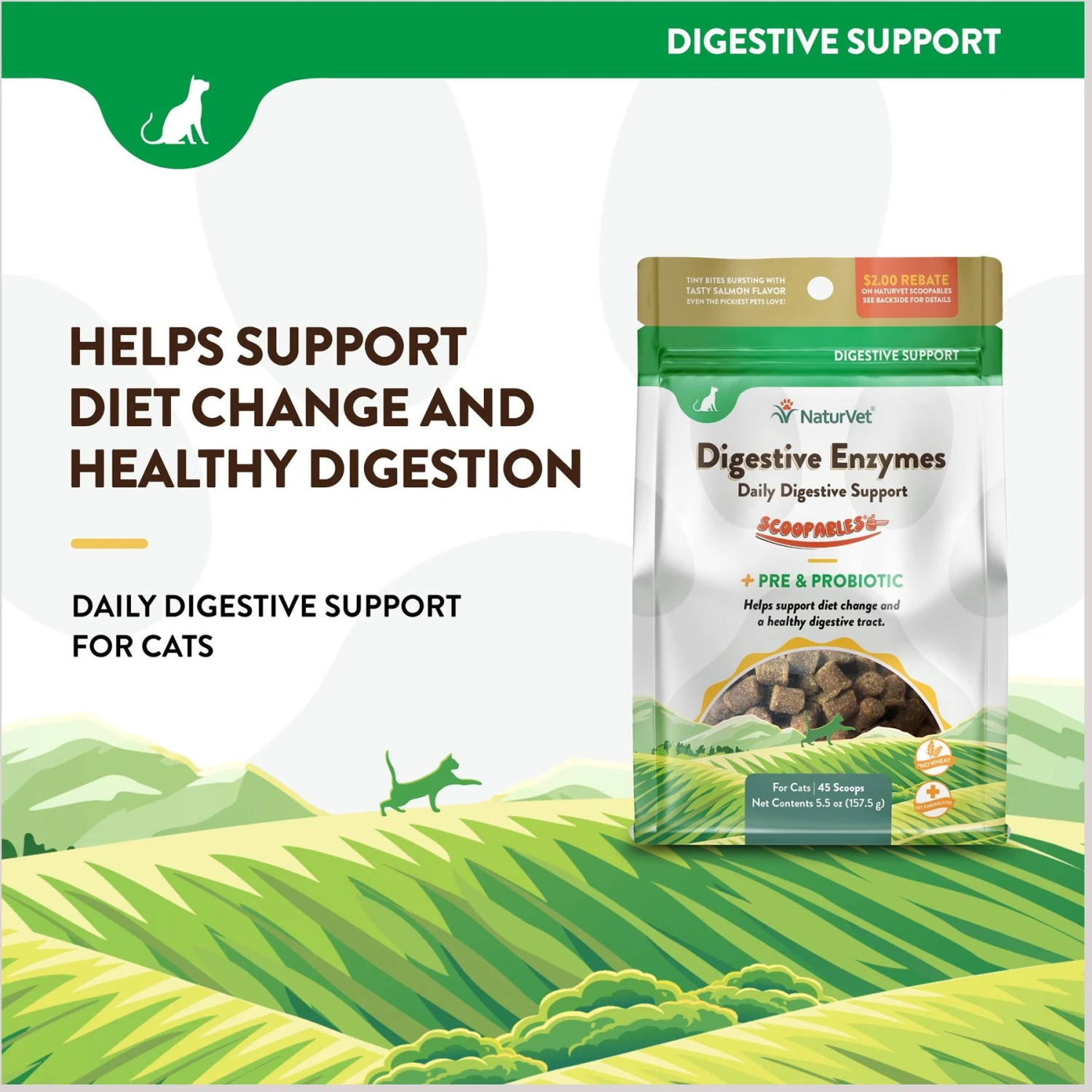 - Prebiotics, probiotics and digestive enzymes help to nourish the natural gut bacteria and help your cat better digest food and absorb nutrients.