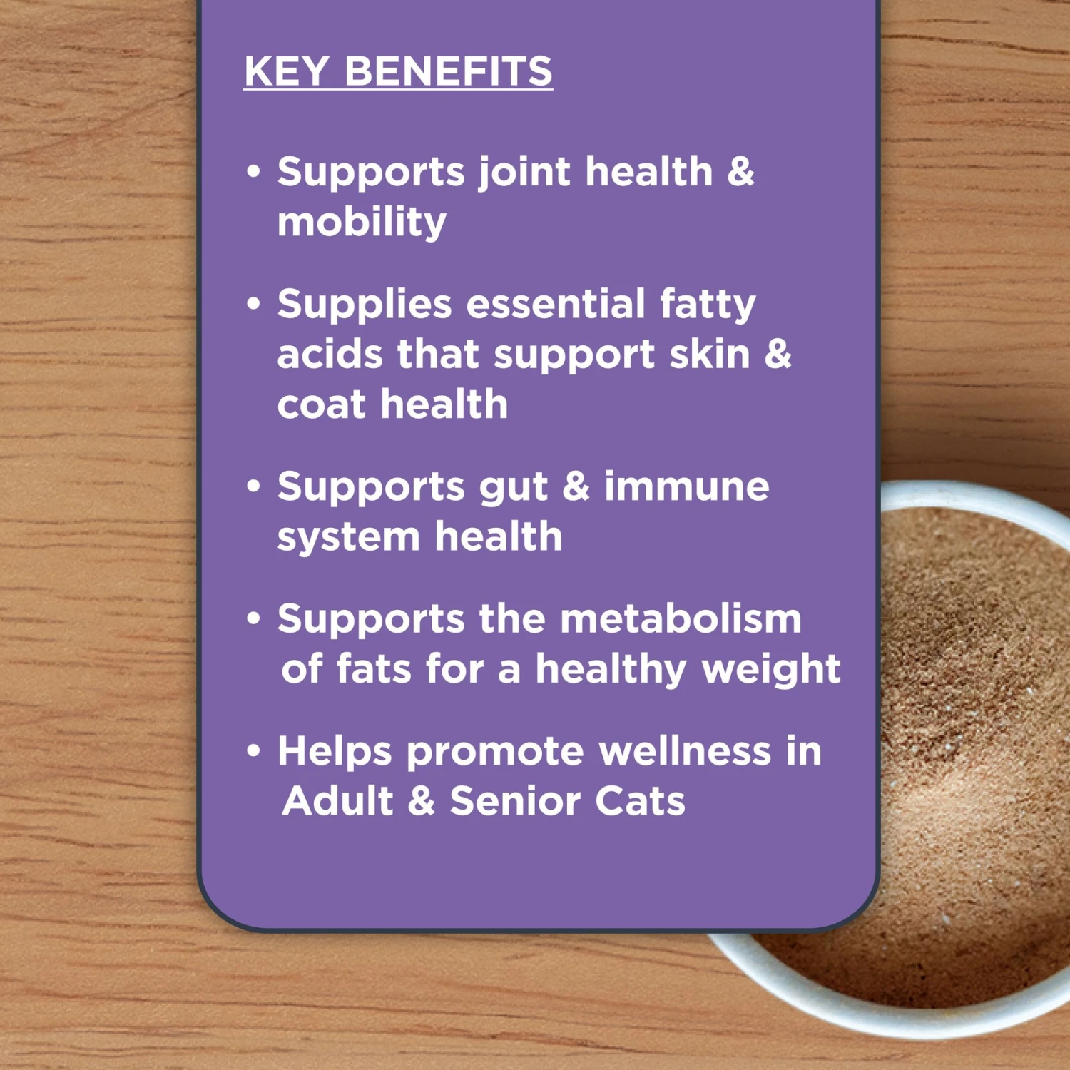 - Flaxseed and fish oil supply essential fatty acids to support your cat’s skin and coat health.