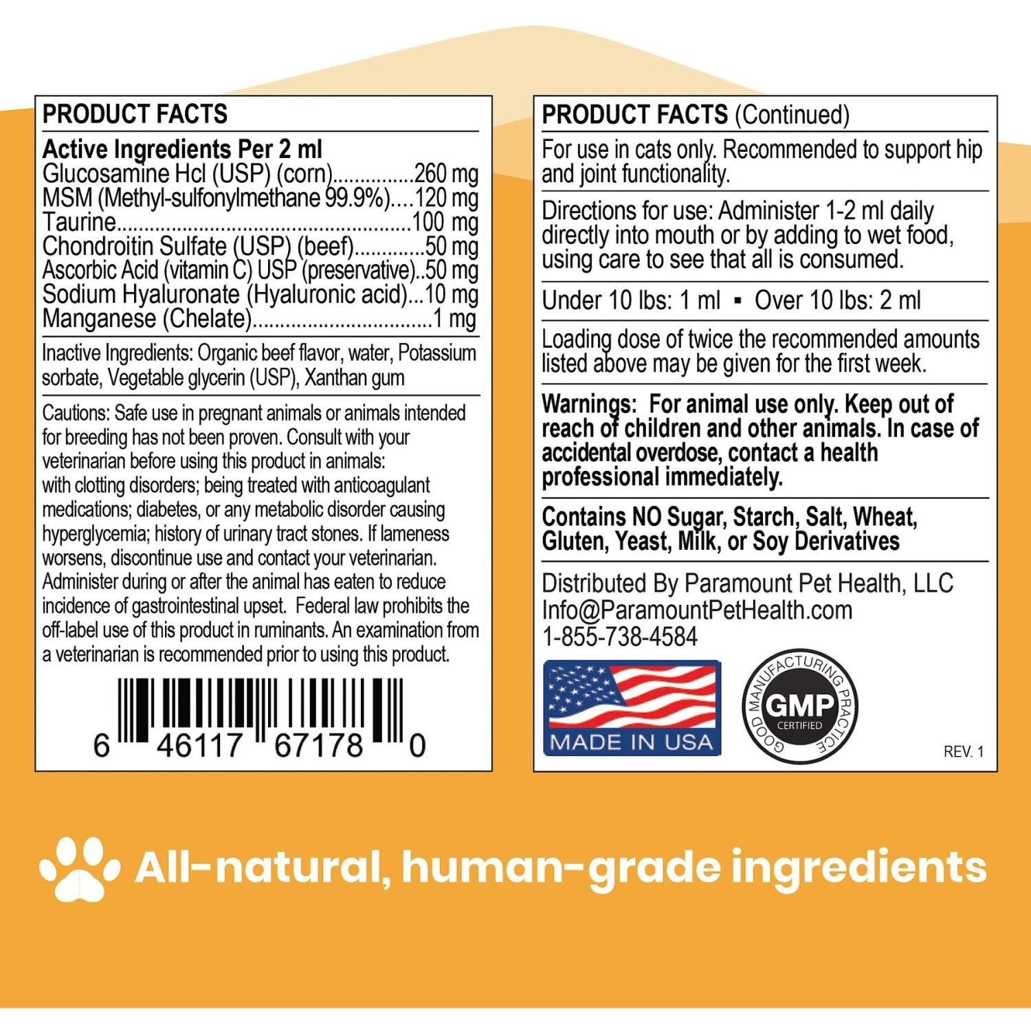 - Includes taurine, an essential amino acid for cats, and hyaluronic acid to help keep joints lubricated.