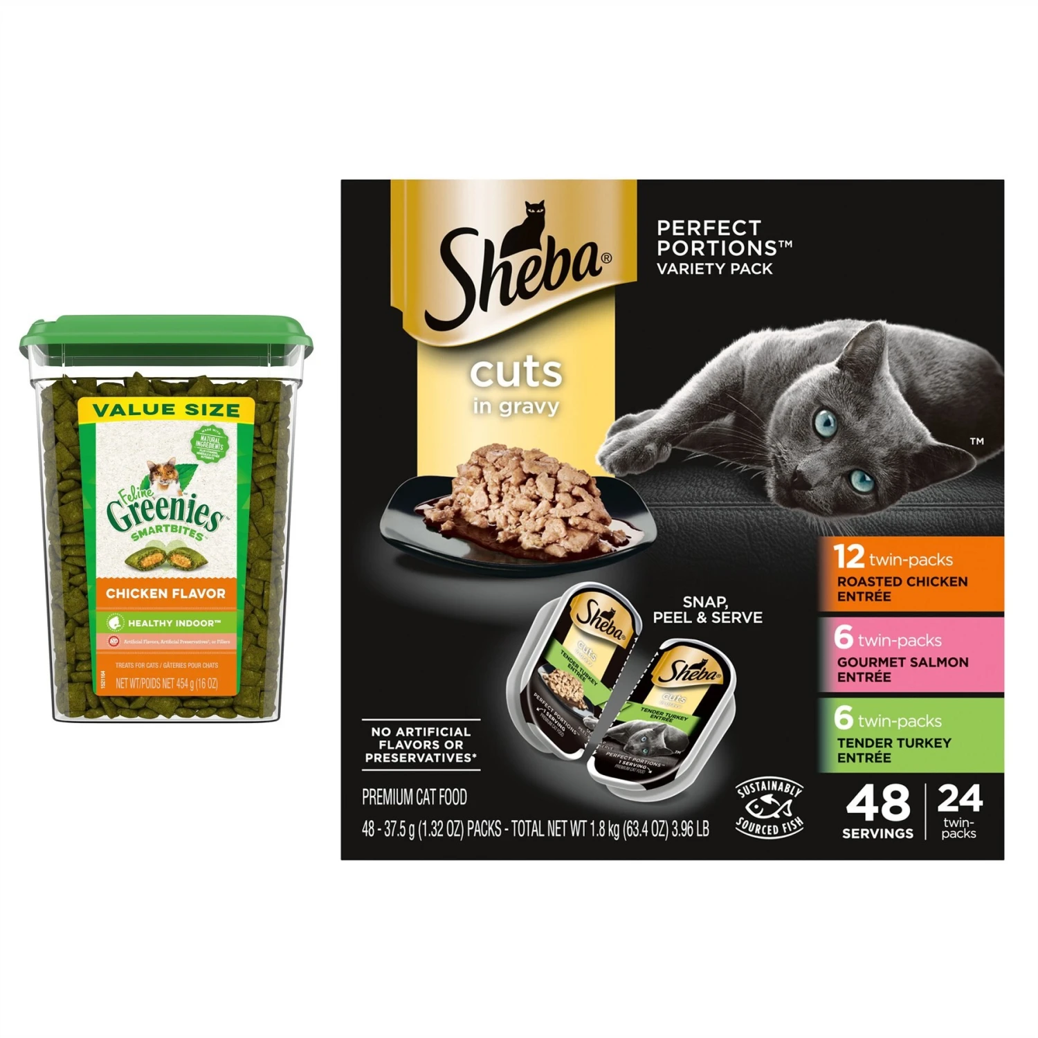 Sheba Perfect Portions Grain-Free Roasted Chicken, Gourmet Salmon & Tender Turkey Cuts In Gravy Variety Pack Adult Wet Cat Food Trays & Greenies Feline SmartBites Healthy Indoor Natural Chicken Flavor Soft & Crunchy Adult Cat Treats