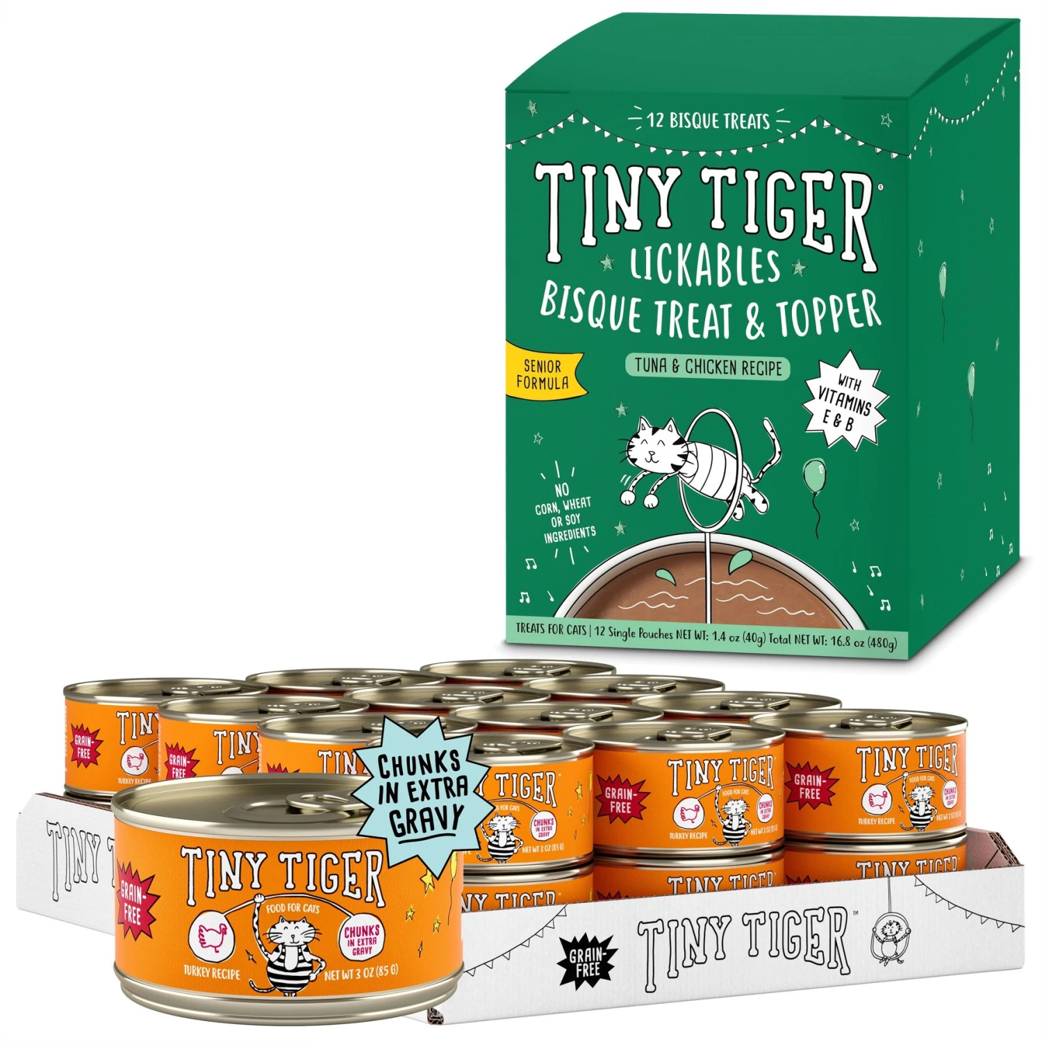 Tiny Tiger Chunks In EXTRA Gravy Turkey Recipe Grain-Free Canned Cat Food & Tiny Tiger Lickables, Senior Formula, Tuna & Chicken Recipe, Bisque Cat Treat & Topper