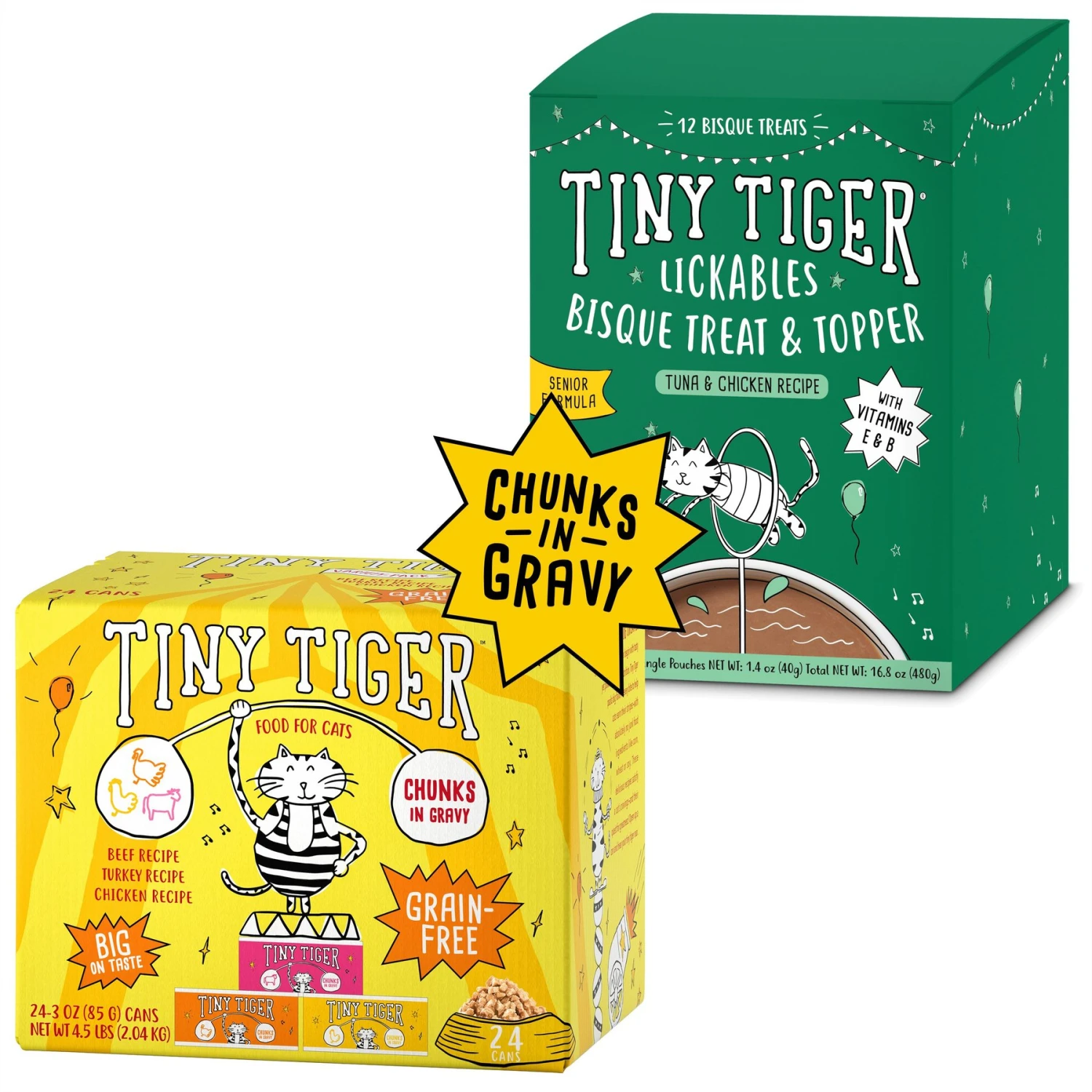Tiny Tiger Chunks In Gravy Beef & Poultry Recipes Variety Pack Grain-Free Canned Cat Food & Tiny Tiger Lickables, Senior Formula, Tuna & Chicken Recipe, Bisque Cat Treat & Topper