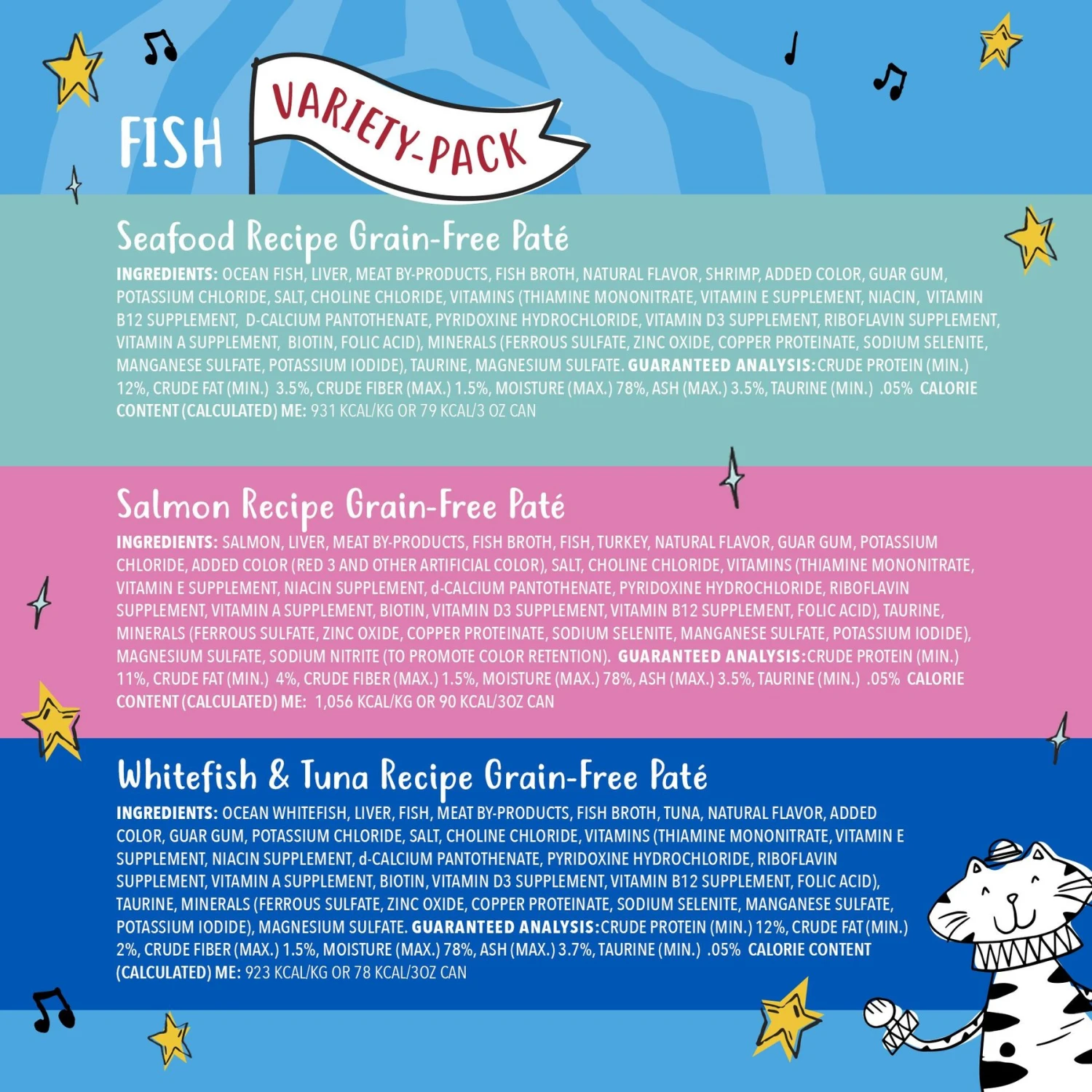 - Grain-free paté variety pack contains three tasty recipes from the sea, including Seafood, Whitefish and Tuna, and Salmon.