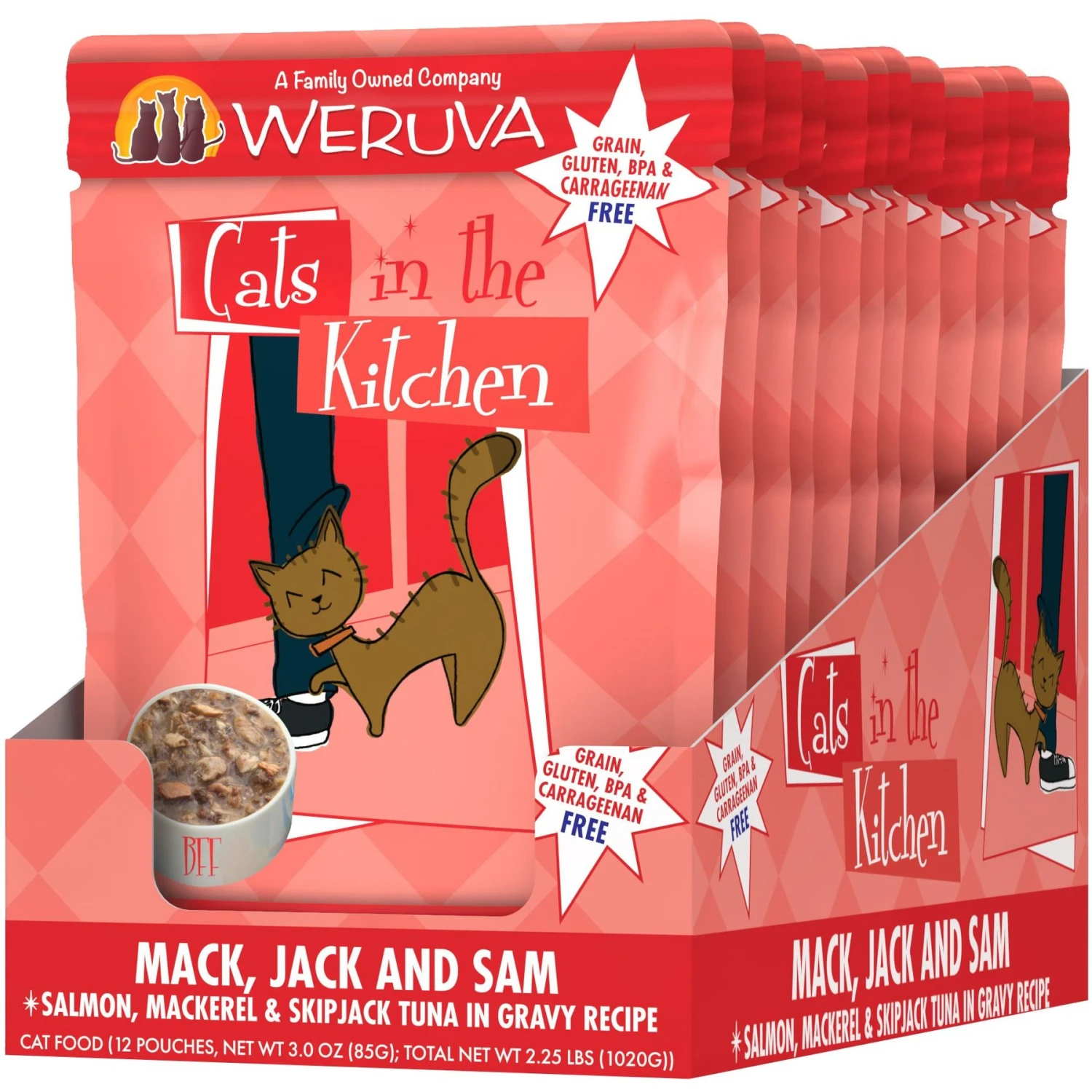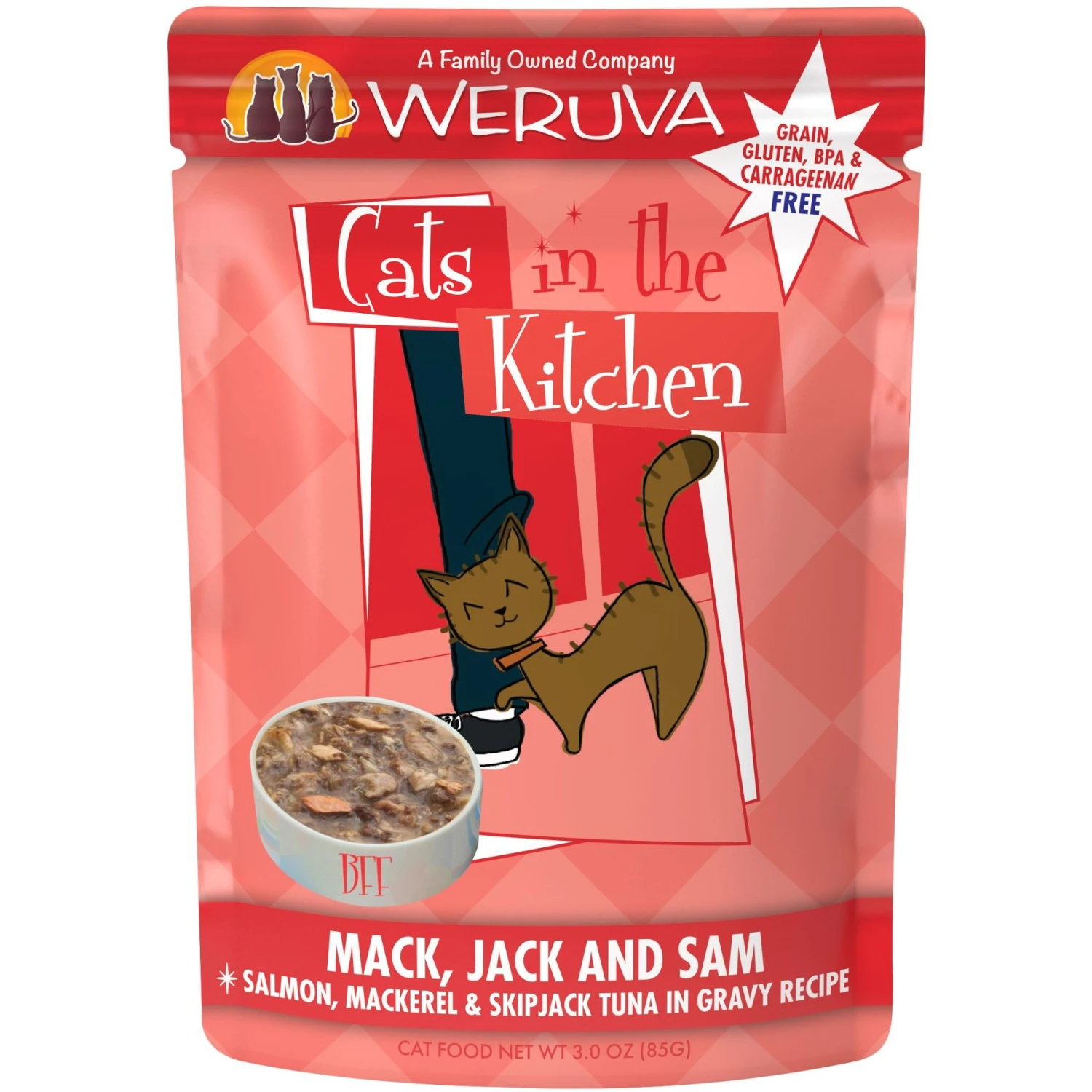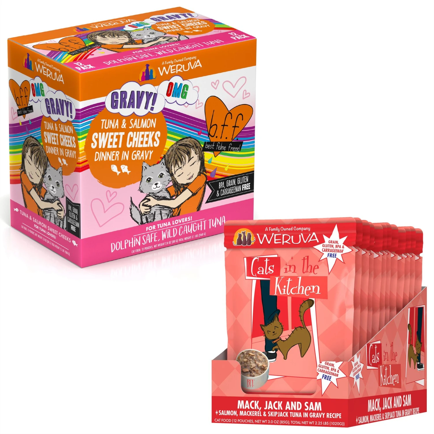 Weruva Cats In The Kitchen Mack, Jack & Sam Salmon, Mackerel & Tuna Recipe Grain-Free Cat Food Pouches & BFF Tuna & Salmon Sweet Cheeks Dinner In Gravy Wet Cat Food Pouches
