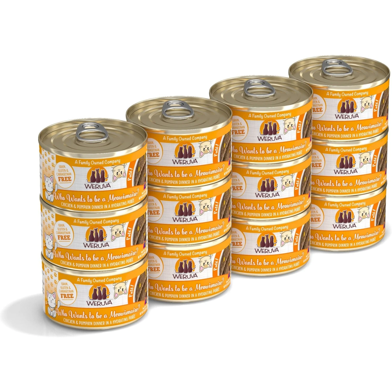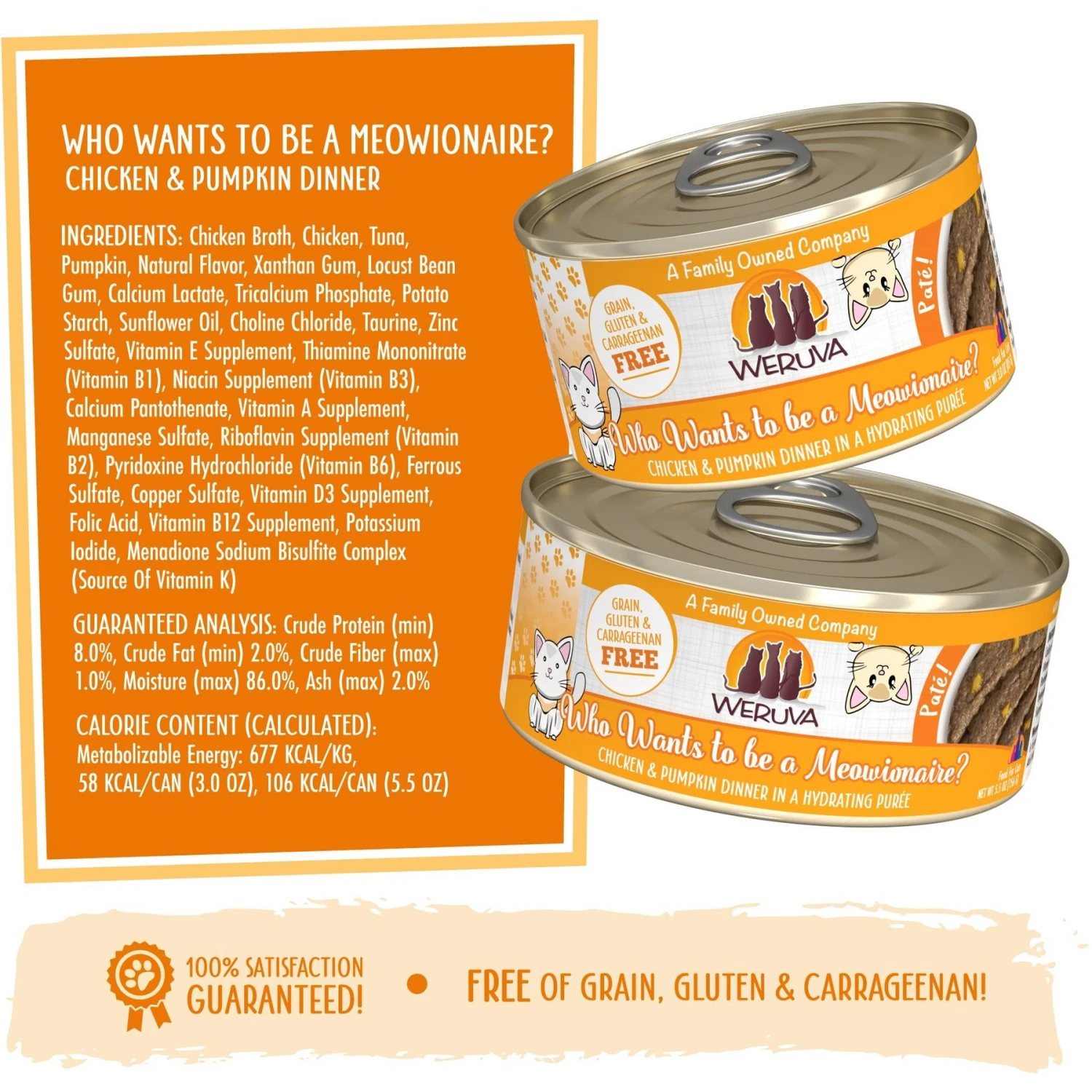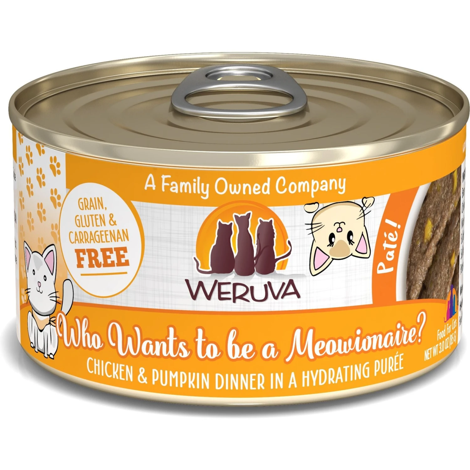 Weruva Classic Cat Who Want To Be A Meowionaire Chicken & Pumpkin Pate Canned Cat Food, 3-oz can, case of 12—Go ahead and phone a fur-iend! If you need to choose a meal for your kitty, we know Weruva’s Classic Cat Who wants to be a Meowionaire Chicken & Pumpkin Pate is the million-dollar answer. This winner-winner chicken and pumpkin dinner is pureed into a paw-fect, silky pate that’s sure to have her licking her bowl clean. You’ll feel good about how you’re nourishing her with the simple wholesome ingredients that you can actually see in the food! Not only is it grain-free, but it’s also made without those not-so-desirable ingredients like gluten, carrageenan and artificial flavors and colors. It will leave your furbaby feline good with the high moisture content that meets her needs. Plus, there are a variety of flavor options with Weruva so you can help kitty find her fur-avorite.