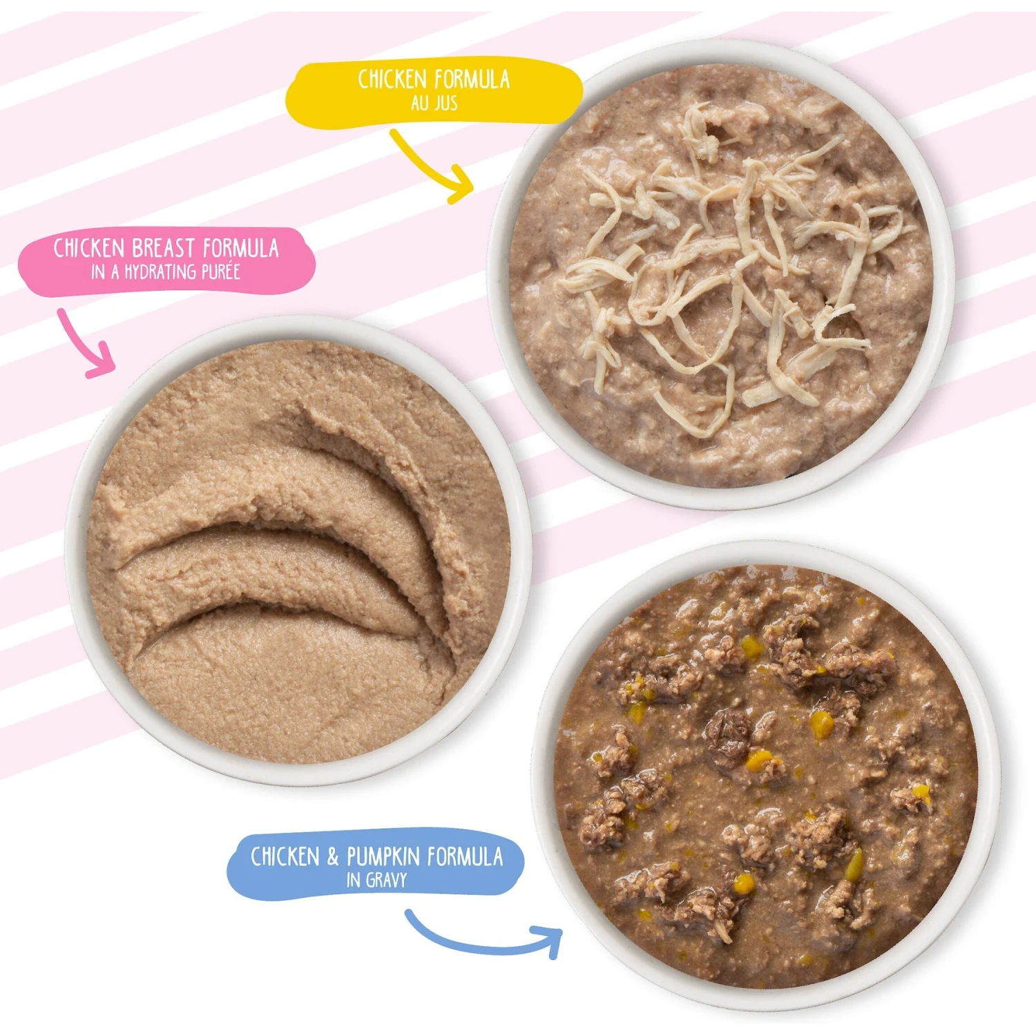 - The Fur Baby Favorites variety pack features three yummy recipes—Chicken Breast in a Hydrating Puree, Chicken Au Jus and Chicken & Pumpkin in Gravy.